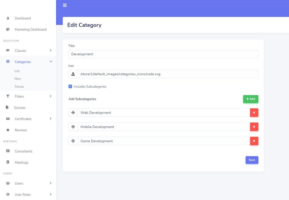 Categories will be displayed on the website header and instructors will assign classes to related categories during the course creation process.