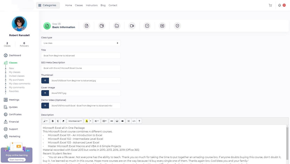 Description: The class description that will be displayed on the class page includes all of the information about the course educational material, instructor, and other related information that will motivate viewers to enroll in the course. We suggest writing at least 300 words for this page because it is one of the most important SEO requirements.