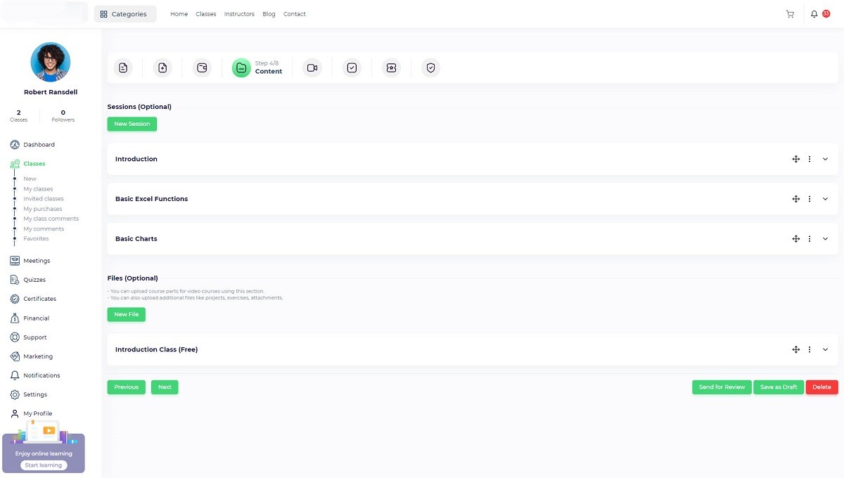 This step is the most important step in the course creation process. All of the course materials like videos, files, projects, live session, assets, circulium, etc will be This steps varies depending to the class type (Live Class, course, text course). We are going to explain different content types that could be defined as course content.