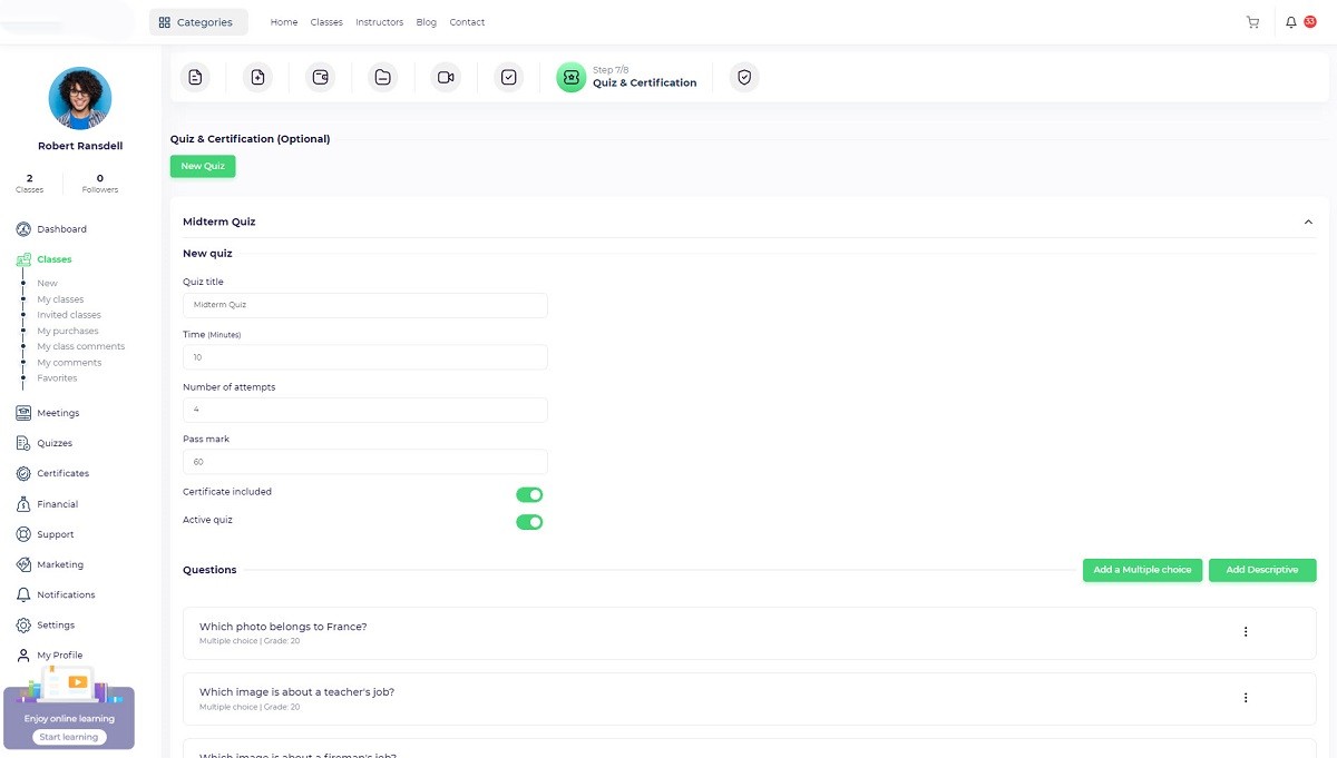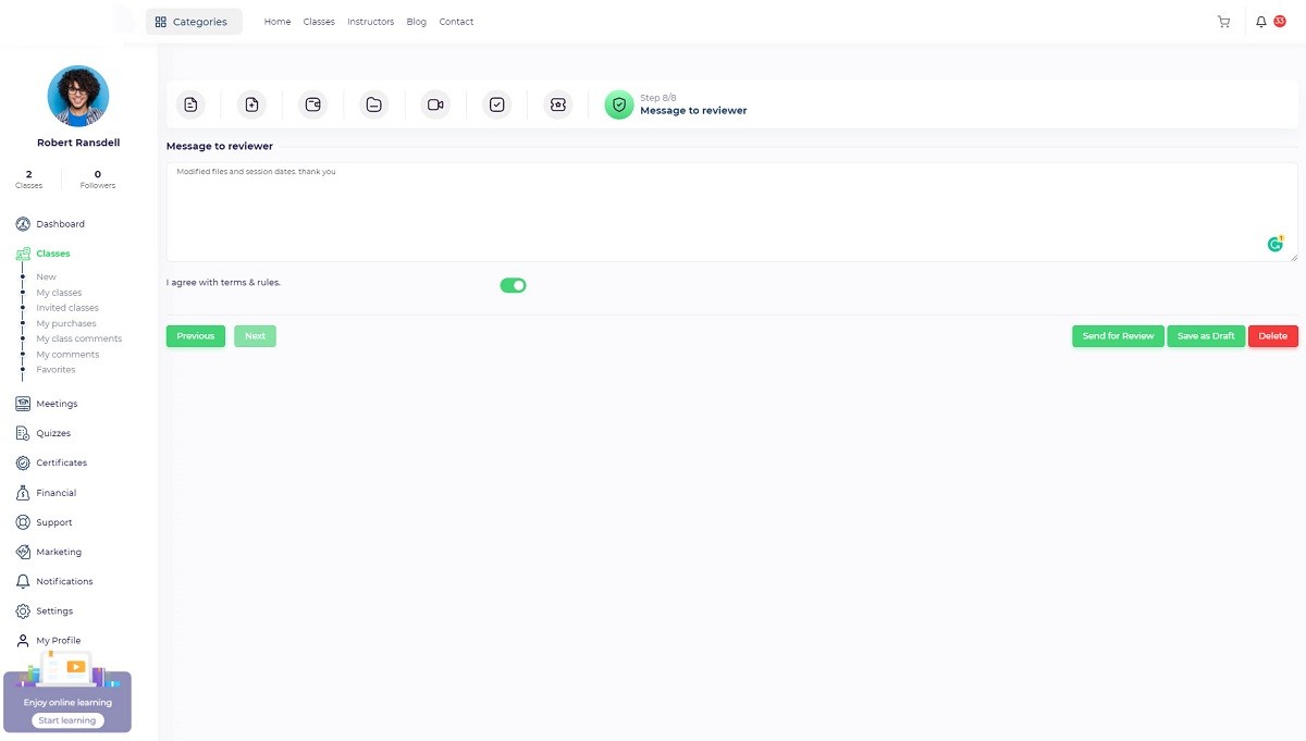 Partner instructor: If you want to invite another instructor to your course, you should turn this toggle on so the partner instructor dropdown will be displayed and you will be to add single or multiple instructors to the course. The invited instructor profile will be displayed on the course page and the invited instructor will be able to view the course through the “Instructor panel/ Classes/ Invited classes”.