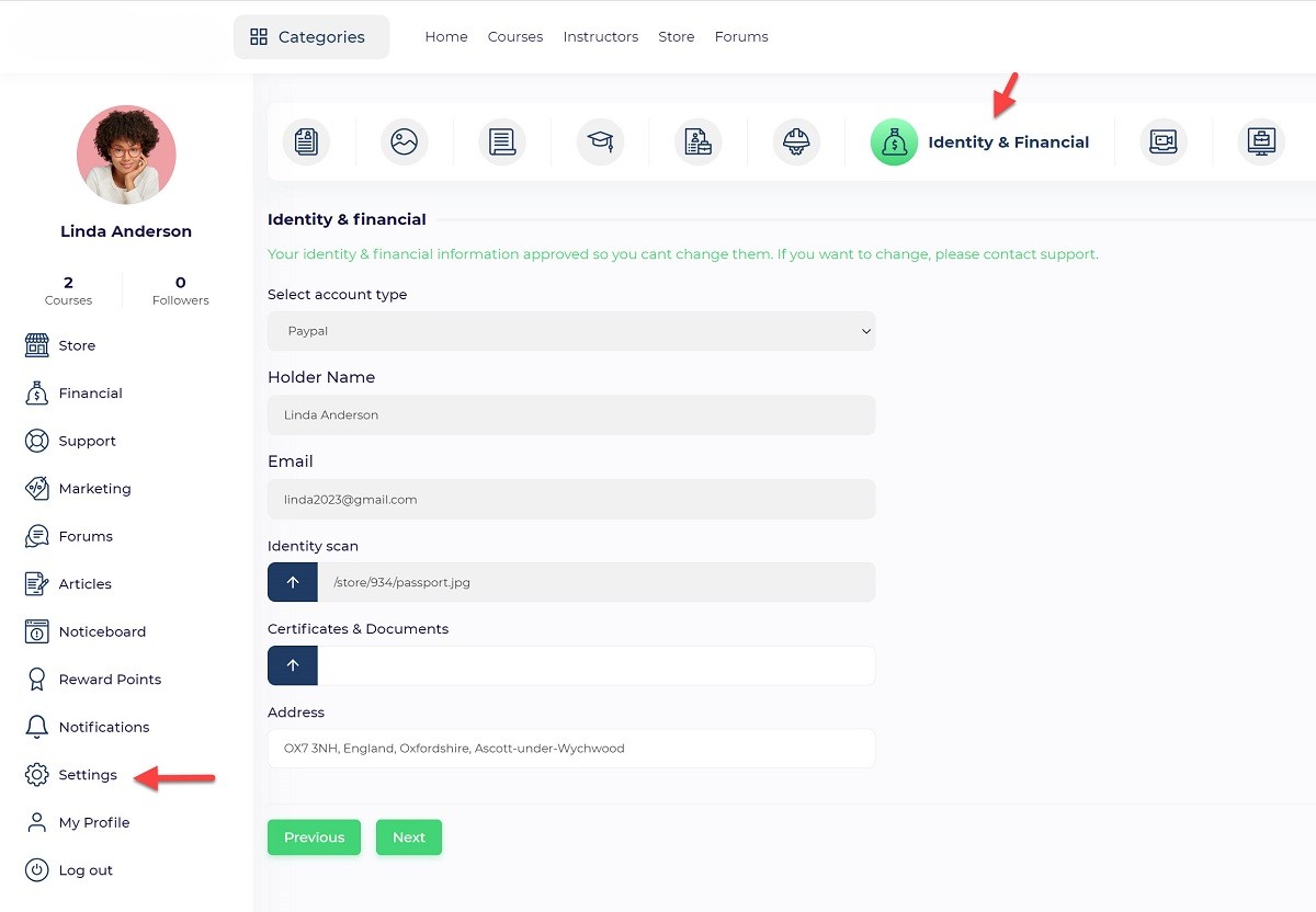 Users can define their payout account information from the “User Panel/ Settings/ Identity & Financial” menu.